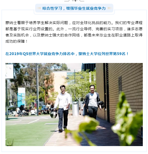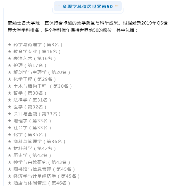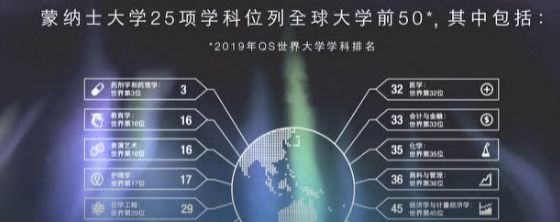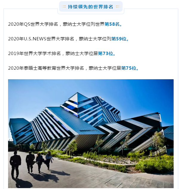 蒙纳士大学是澳大利亚八校联盟成员大学 (Group of Eight) 之一。这所久负盛名的世界名校,一直保持着卓越的教学质量与科研成果,其教学和科研均获得国际高度认可,使得蒙纳士大学常年稳居全球大学百强之列!