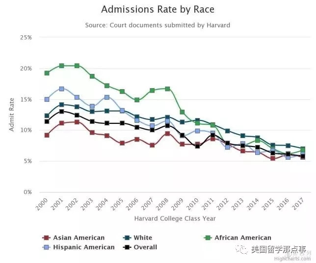 虽然,这些藤校一再否认招生中有不公平现象,但是,由哈佛大学提供的各个族裔的入学率表明,亚裔学生的录取率是最低的。