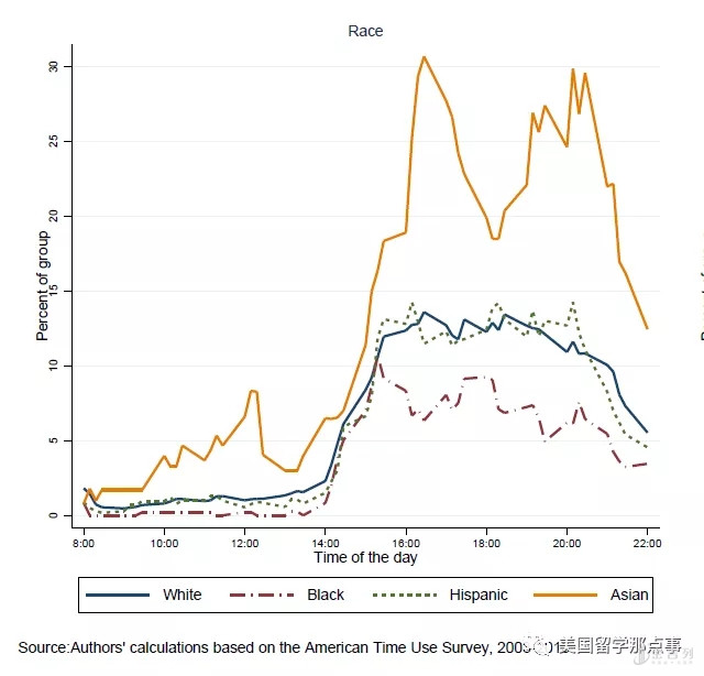这张图展示了美国各族裔高中生每天早上8点到晚上10点做功课的时间,下午3点放学以后,代表亚裔的黄线远远超过了其他颜色的线,可以看出亚裔学生做作业的时间最久,睡得也最晚。