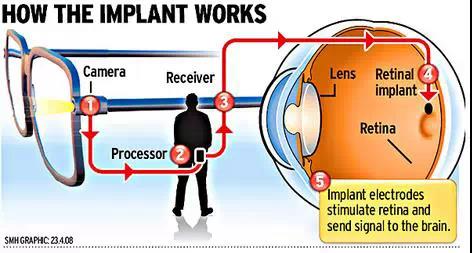 如今澳洲加速生物眼的研发,已经研制出人类首个仿生眼样品。该成果将在人头骨内安装微芯片,并通过在眼镜上安装摄像头来帮助盲人看到周边的环境轮廓。如果投放成功,仿生眼将给世界上85%法律上失明的人带来帮助。Monash大学教授阿姆斯特朗(Mark Armstrong)表示,仿生眼试用计划明年开始,该装置会让使用者拥有更多移动的自由。他说:“(仿生眼)前方有一个类似于苹果手机照相机的摄像头,可以捕捉动态颜色。图像被传导到精密处理器上被分解为信号。”信号被无线传输到安装在脑部后面的装置上。装置由一系列瓷片组成,每个瓷片上均有显微电极,这些电极被嵌于脑部视觉皮层中。
