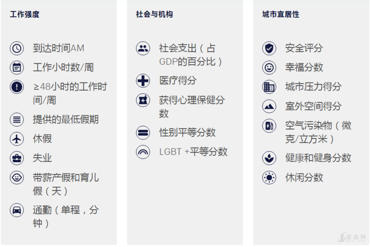 这三大构成,合共20个要素,来小结算出城市指数值。这种要素包含每星期综合工时、通勤时间、假期日数、有薪假、性別公平、开心指数值、是不是非常容易获得精神实质诊疗照料、城市安全性水平、是不是有充足室外室内空间和空气污染指数等。
