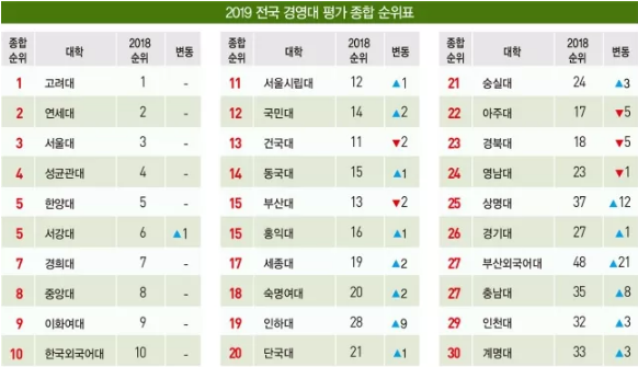 祥明大(25)和釜山外国语大(27)分别上升了12位,21位,成功进入了前30名。有升就有降,明知大、大邱大、韩国航空大、江原大均降了超10位,跌出top30。