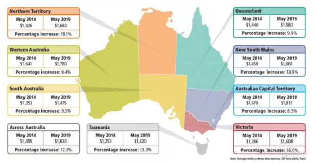 8月底,澳大利亚统计局(Australian Bureau of Statistics,ABS)发布了最新的收入数据,2019年5月的澳大利亚成年人的平均周薪为1634澳元,西澳的薪资均值为$1780/周,冠绝全澳大州之首,仅仅以31$稍逊于堪培拉首都地区。