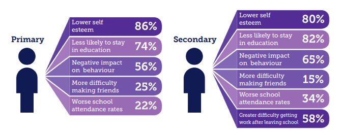 80%以上的中小学老师 都认为会让孩子自信心低落,学习成绩跟不上,还有一半的老师认为,会造成孩子行为消极,社交困难。