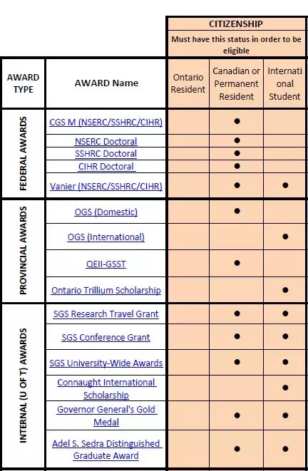 http://www.sgs.utoronto.ca/Documents/Grauate+Awars+Eligibility+Chart.pf