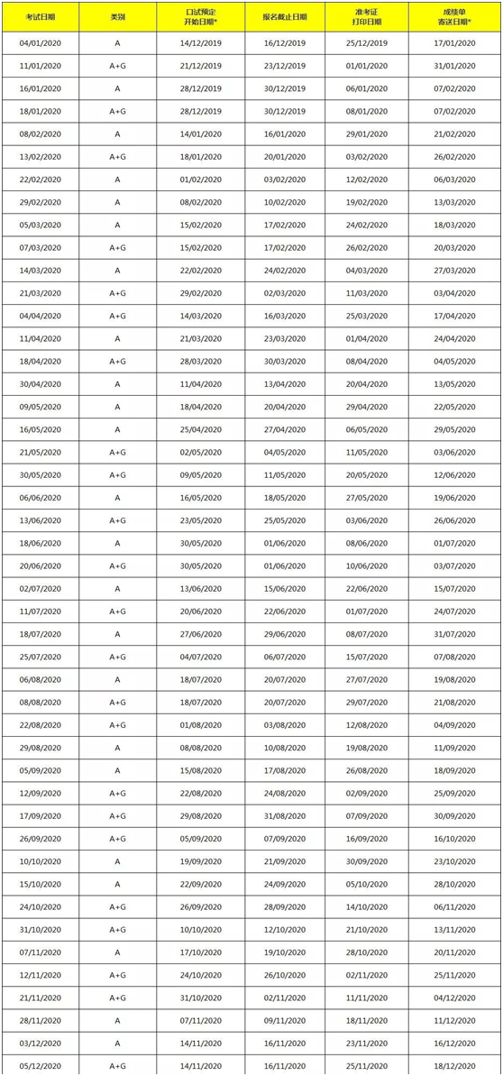 2020 年雅思考试报名 截止日期、准考证打印日期和成绩单寄送日期