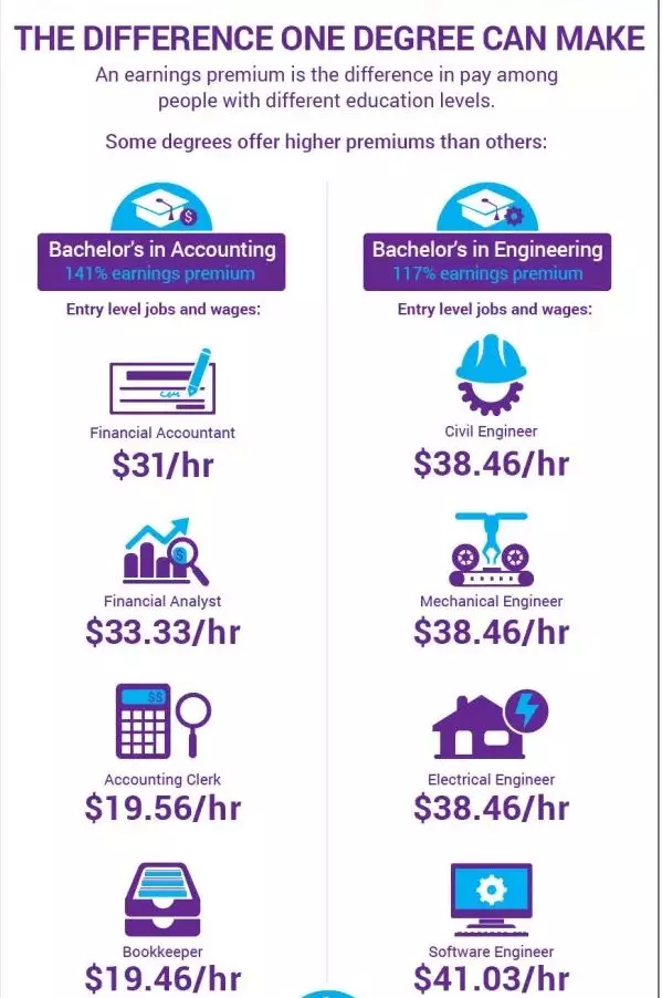 虽然读的是同一学位,学历水平,职业选择不一样,工资差别也挺大的,拿最常见的两种学位:会计 & 工程 & 护理来说: