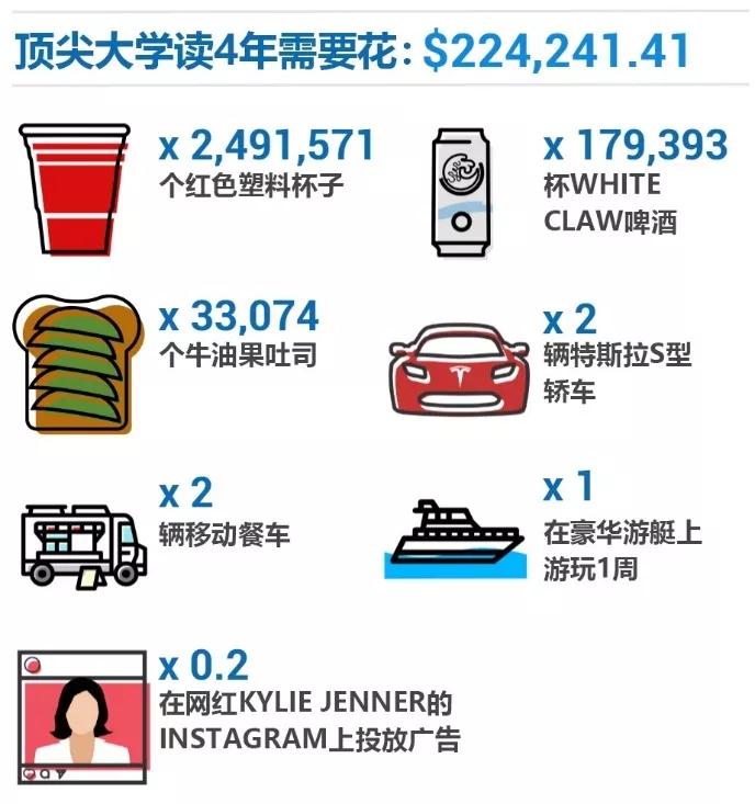 怎么样? 看了上面的图示,是不是顿时感到心痛? 读大学四年花的钱够你买两辆超级拉风的特斯拉轿车了; 如果你某门课不小心挂掉,需要重修的话,选课的费用够你买一张泰勒·斯威夫特演唱会的门票了,而且还是前排雅座哦; 如果你在课堂上打瞌睡,浪费了一节课的时间,那就相当于弄丢了一副AirPos无线耳机,你还敢上课不听课吗,还想逃课吗? 更不用说你读大学的钱都是父母辛辛苦苦挣来的! 调查显示,大学生用在休闲娱乐上的时间比用在学习上的时间要多,而上班族工作的时间是大学生学习时间的两倍,也就是说,你们父母辛苦工作的时间是你们学习时间的两倍。