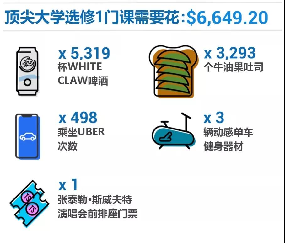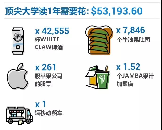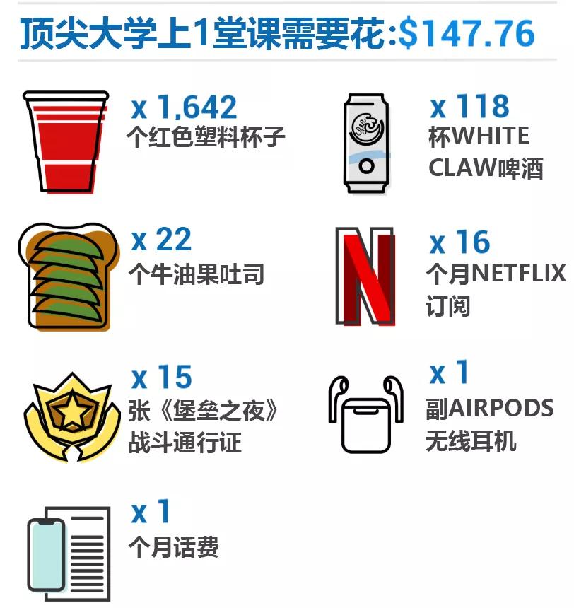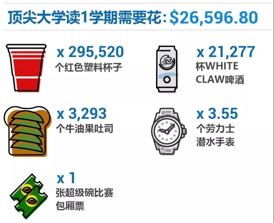 光用数字来说明留学的费用,大家可能会觉得很抽象。 下面我们就用几张图,来让大家更直观地看看,要在美国顶尖大学读书,究竟得花多少钱。 以下提到的费用,指的是《福布斯》发布的前10名顶尖大学的平均费用。