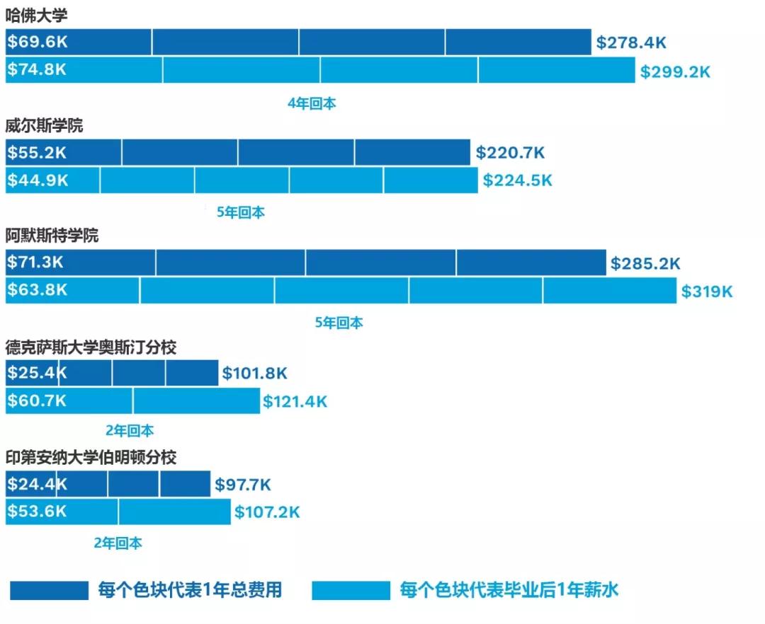 从上图可以看出,哈佛大学一年总费用6.96万美元(含学费及其他杂项),毕业生平均年薪7.48万美元,要不吃不喝工作4年才能回本。 阿默斯特学院一年总费用7.13万美元,毕业生平均年薪仅为6.38万美元,要工作5年才能回本。 而公立大学则实惠得多,教学质量和毕业生年薪都不输私立精英学校,仅需两年即可回本。