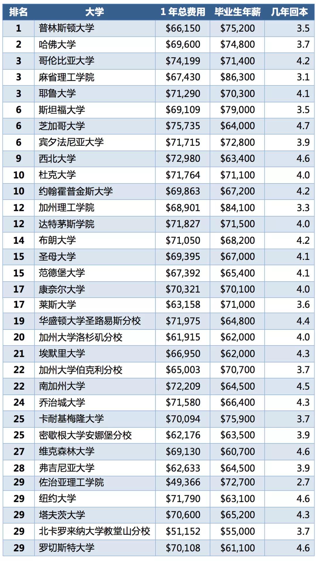 最后我们来看一下各大顶尖高校学费及毕业生起薪情况: