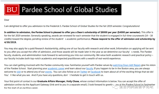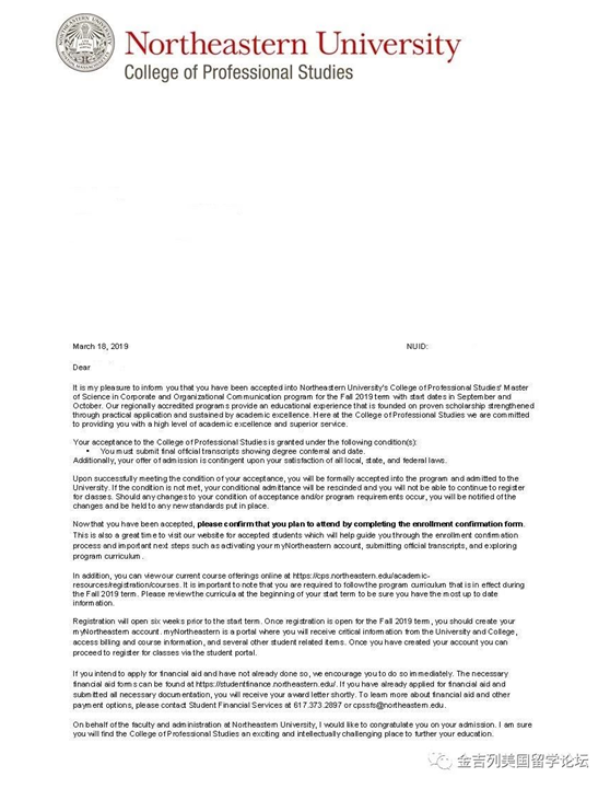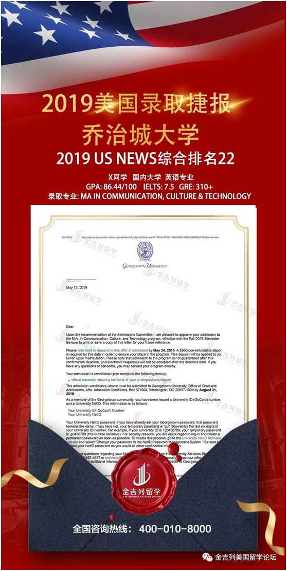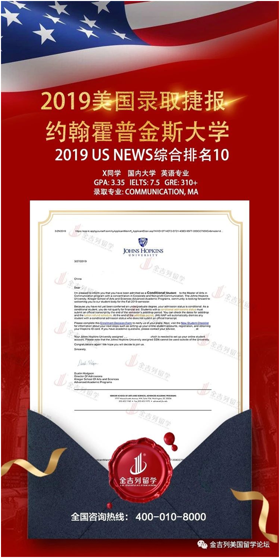 审理周期 : 学生一直对目前 319+3.5 的 GRE 成绩不甚满意,有再次刷分的意愿,但是动力不是很强。因此申请寄出相对晚, 1 月末寄出约翰霍普金斯,波士顿等学校; 3 月初寄出乔治城,东北等学校。 约翰霍普金斯 3 月 29 号出结果,但是其中关于申请材料有个问题。 我们成绩单认证,推荐信,送分都到位后,学校的状态也一直不标记为齐全,在跟进时学校告诉我们: Goo morning Xie, New amissions policy oes not allow us to sen international stuent to committee review unless they have submitte their transcripts electronically an there is a egree poste on their transcript or WES Evaluation. Base on this new policy we cannot offer you a ecision on your application until you have grauate an submitte a final transcript or WES Evaluation. 针对这个问题,又积极和学校联系,并提供大四上的成绩单。最后材料于 3 月 19 齐全,一周后录取。 背景分析 虽然学生是英语专业的,但是已有了将近一年的采访和新闻写作经历,这个经历和写作基础对学生的申请是非常加分的。
