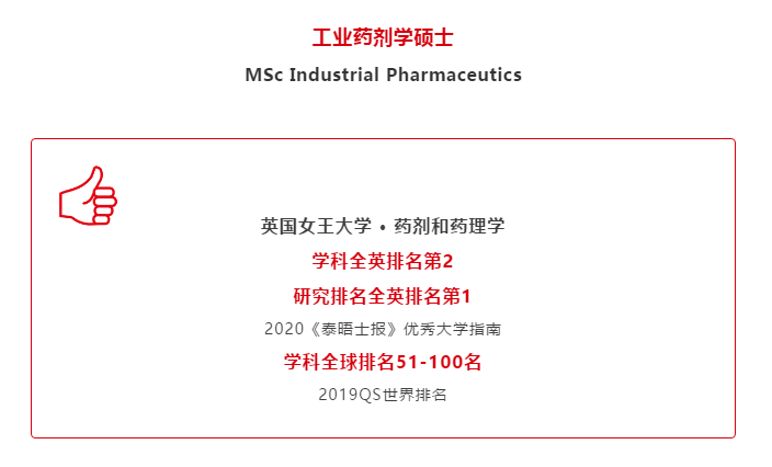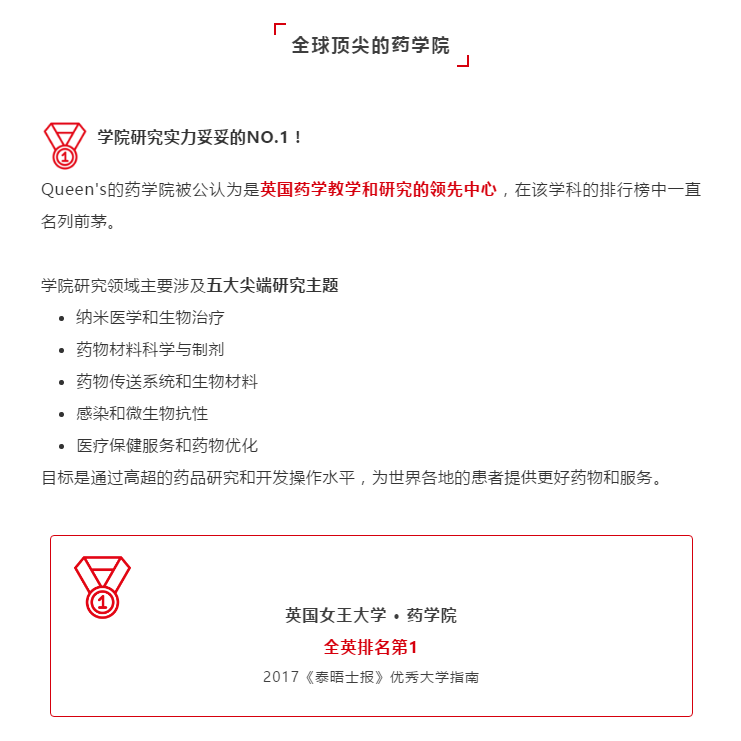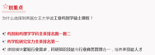 Queen's紧贴全球制药行业发展动态,并结合学院强大教研实力基础,设计出这个工业药剂学硕士课程。目的是为有志投身制药行业的学生们提供多方面的专业知识和技能,涵盖从开发、测试、生产以及质量保证等一系列药物开发阶段,帮助大家在制药行业多元化发展。