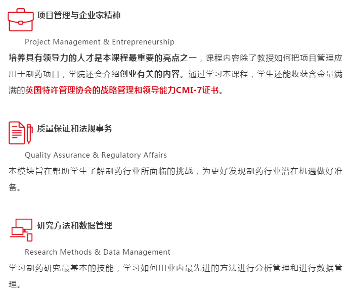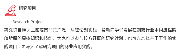 从课程模块可以看出,既有药物研发生产等的理工技术型教学,又有数据管理、领导力培养、以及行业洞悉等商务管理类培训。