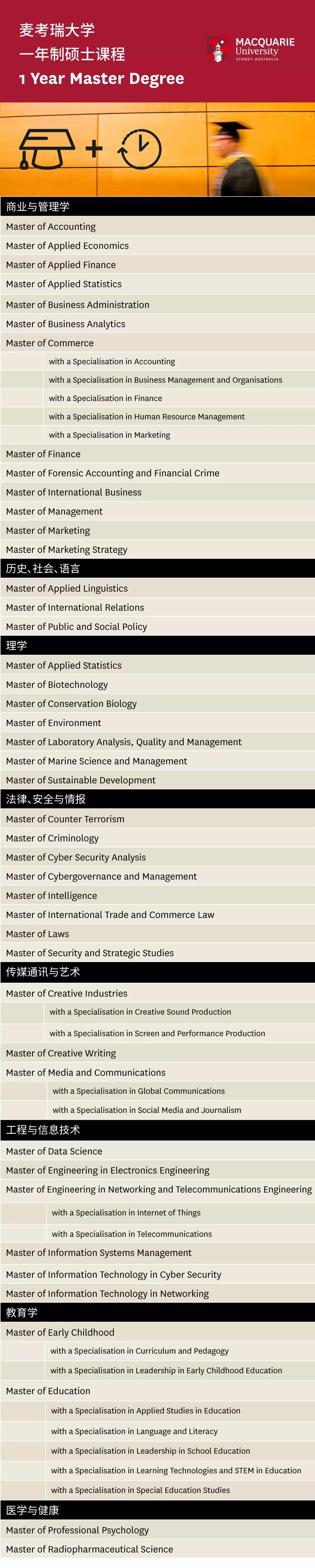 麦考瑞大学面向国际学生共开设 62种一年制硕士课程,课程涵盖八大领域,是目前澳大利亚规模最大的一年制硕士课程。
