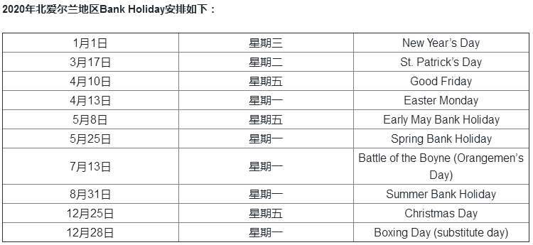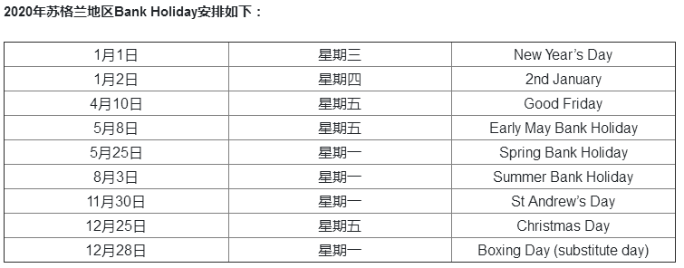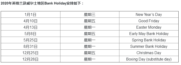 英国节假日安排: