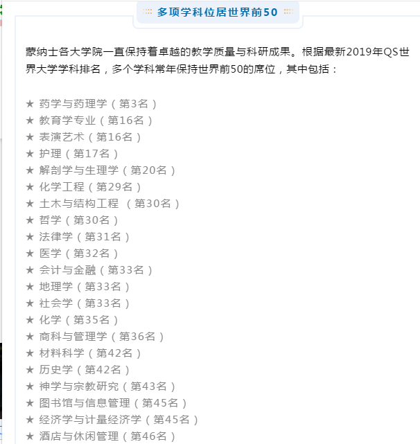 蒙纳士大学是澳大利亚八校联盟成员大学(Group of Eight)之一。这所久负盛名的世界名校,一直保持着卓越的教学质量与科研成果,其教学和科研均获得国际高度认可,使得蒙纳士大学常年稳居全球大学百强之列!