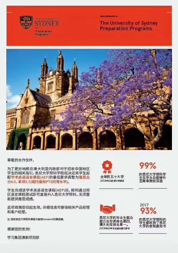 重磅消息!!!悉尼大学预科降低语言直升班( AEP)最低英文要求!!!雅思总分4.0各单项不低于3.5 即可配对应周数语言直升班衔接悉尼大学预科。新政即时生效!!!详情如下: