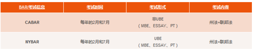 Bar Examination由每州各自的机构独立管理,所以每个州的律考要求都不一样。但美国有统一律师考试,称为Uniform Bar Examination(简称UBE),其中主要规定考试时间和考试题型。采用UBE考核方式的地区有:科罗拉多州、哥伦比亚特区、华盛顿等28个州。