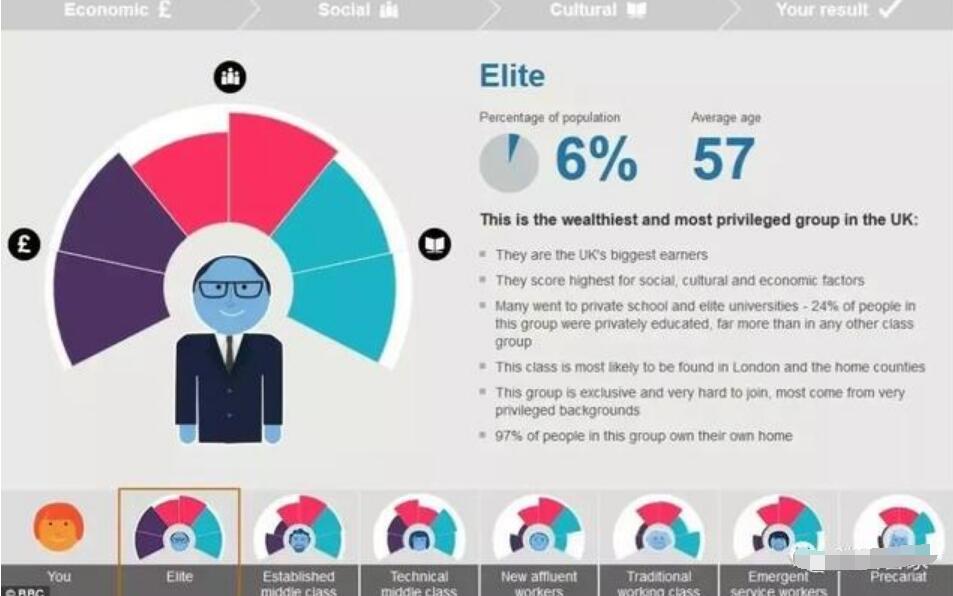 精英阶层: 占总人口的 6% ,英国社会最富有和地位最高的阶级,因其经济资本和社会资本远超出其它六个阶级而高居各阶层之上。这个阶层大多接受了私立学校教育,并拥有牛津剑桥等世界著名大学的文凭, 身为各行各业的精英,他们的社交圈相当封闭,只与同阶层的人交往。