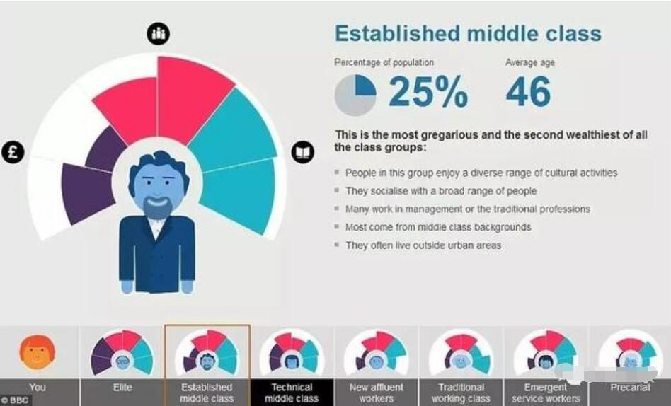 稳定中产阶层 :稳定中产阶层占人口的 25% ,财富仅次于精英阶层,经济、社会和文化资本均相当雄厚。这也是各阶层中社交层面最广泛的阶级。作为受过高等教育比例最高的一个阶层, 他们通常身为大公司的管理层或者是各领域的顶尖级专业人才,父母多为中产阶层。