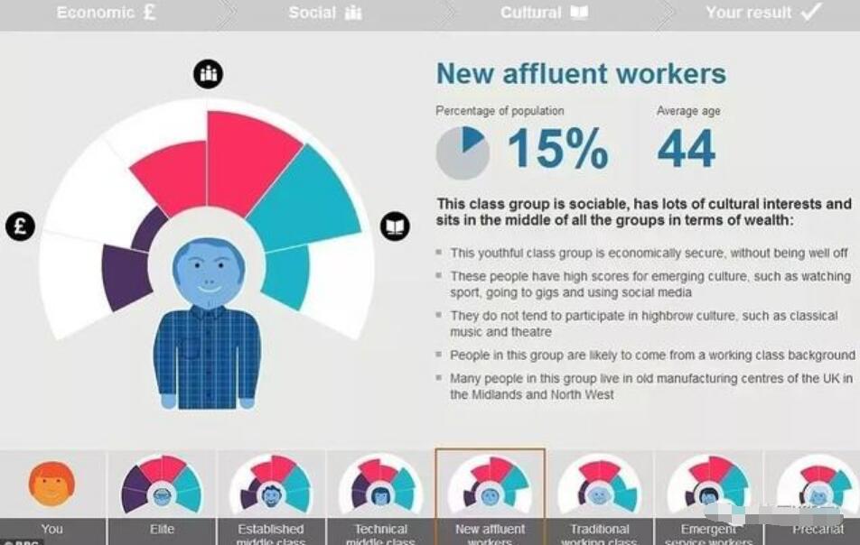 新兴服务业工作者: 同样为新兴阶层,却占总人口的近五分之一,平均年龄仅 34 岁。虽然拥有较低的经济资本,但却有着高级别的新兴文化和社会资本。这类人超级喜欢爵士或摇滚演奏会,热爱运动,也活跃与社交媒体。他们从事的职业包括厨师,护士,产品助理等等。