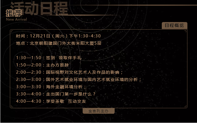 活动内容核心主要围绕艺术源于生活也要应用于工作为主旨,分别针对国际视野、国内外艺术就业、走出国门第一步以及海外金融环境分析来展开交流会议分享。