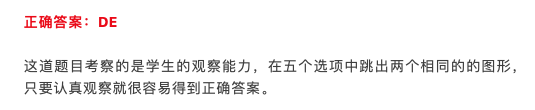 图形推理题中会涉及平面图形、立体图形、镜面对称、图形变化/组合/分解等等,主要考察的是 学生的逻辑思维能力以及观察分析能力 。
