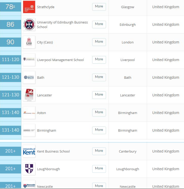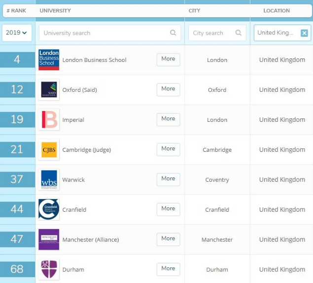 QS 2020 世界 MBA 排名前 100 的大学里,有 10 所是英国大学,其中排名最高的是第 6 名的英国是伦敦商学院( Lonon Business School ),其次是剑桥和牛津,分别排第 15 和第 16 名。世界百强 MBA 名单里的英国大学还有帝国理工( 19 )、华威大学( 34 )、曼彻斯特大学( 48 )、克兰菲尔德大学( 51 )、杜伦大学( 74 )、爱丁堡大学( 76 )、伦敦大学城市学院( 90 )。