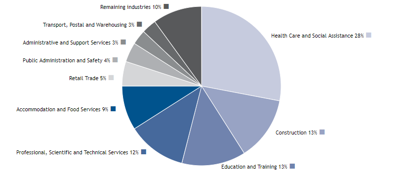 随着澳大利亚人口不断老龄化,及全国伤残保险计划的落实,澳大利亚对于健康相关行业的需求也不断增加。具体而言,根据澳洲就业部,截止至2023年,健康行业的就业率将增长14.9%,增长约250,300个工作岗位,占比所有新增岗位中的28%,为所有行业中未来五年增长最快、占比最高的行业。