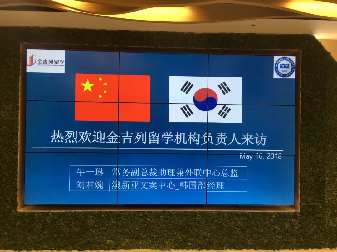 下午,金吉列探访团来到了汉阳大学鞍山校区,鞍山校区最高负责人尹锡满部长对于金吉列的到访表示热烈欢迎,并在校园所有的屏幕上写满了欢迎词,足以看出汉阳大学鞍山校区与金吉列的友好之情。