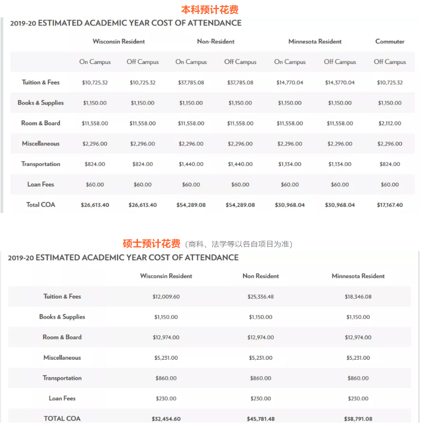 威斯康辛麦迪逊本科花销大概为 $54,289,商科专业学员再附加交纳 $1,000.08,工科学生再附加交纳 $1,399.92,大学本科级新生附加交纳 $275,转学生再附加交纳 $200。国际性生有 Merit-base 学业奖学金。