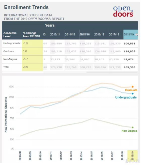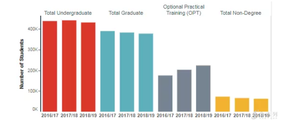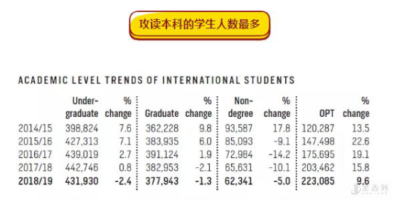 2019年“开放门户”报告显示,赴美留学的近110万国际生当中,读本科的人数最多,约为43.2万人, 下降了 2.4 % ,而攻读研究生学位的人只有约37.8万人,下降了1.3%。非学位项目的学生人数下降了5.0%,为62341人。