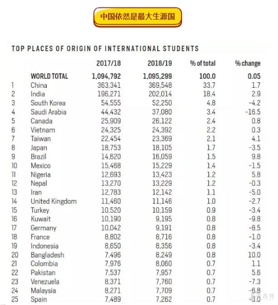 中国连续第10年成为美国最大的国际学生来源国 ,2018/19学年有369,548名学生就读于本科、研究生、非学位和选择性实践培训(OPT)项目,比2017/18学年增加了1.7%。中国学生数量庞大, 占到全部国际生数量的33.7%