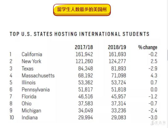 吸引留学生最多的州是加州、纽约州、德克萨斯州、马萨诸塞州、伊利诺伊州、宾夕法尼亚州、佛罗里达州、俄亥俄州、密歇根州和印第安纳州。我们可以看到,第一名的加州国际生人数虽然相对减少了一点点,但这并不妨碍国际生对加州的喜爱。气候温暖的加州有著名的世界级学府,也有沙滩、大海,有灯火辉煌的高楼和车水马龙的街道,有好莱坞和主题乐园,更有无数学子向往的硅谷~ 而纽约作为国际金融中心,有华尔街,有世界500强的总部,也有中国人最喜爱的法拉盛,有Queens,有布鲁克林大桥,是追梦的地方,当然也有Shake Shack。去纽约的国际生增长2.5%。其中大多数国际生都就读于纽约大学,哥伦比亚大学,纽约州立大学布法罗分校和康奈尔大学。**** 第三名的德州则减少了2.9%,而去年这一数据仅为- 0.9%。麻省作为美国东部颇具精英式教育风格的一大学术重地,有着诸多世界顶尖知名大学, 如:哈佛、MIT、波士顿学院、塔夫茨大学、威廉姆斯学院、阿姆斯特学院等,自然 颇受国际生的喜爱,涨势明显,为4.3%。