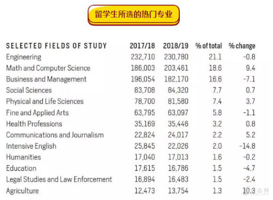 STEM依然是热门专业 , 工程专业就读人数较去年减少0.8%,虽然选择工程专业的学生人数有所下降,但是依旧占到总人数的21.1%。数学和计算机科学就读人数上升9.4%,超过商科排名第二,占到总数的18.6%。可见大家对于计算机科学的重视程度,而且当今社会,编程算是一项很有前景,很值钱的技能了。商科虽然是国际生的热门专业,但是同比下降了7.1% ,虽然总数下降,但是依旧位居第三,占到总数的16.6%。下降幅度最大的是上英语强化课程的人数 。教育专业人数也在减少。说明现在留学生选择专业越来越务实,会 更多考虑未来就业 。