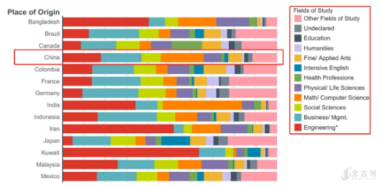 来自中国大陆的学生,我们可以看到学习最多的依旧是工程和商科,其次是数学和计算机科学,物理和生命科学,有一部分的学生学习艺术专业和社会科学。