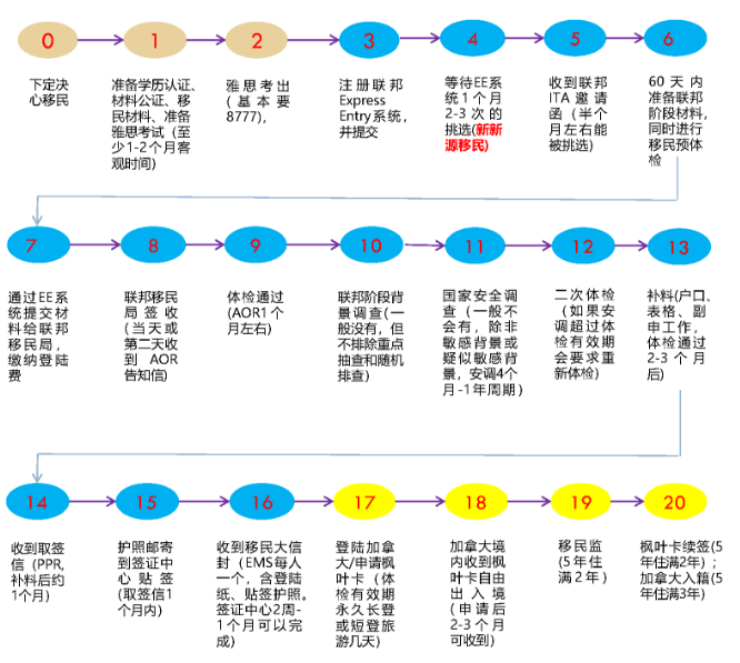 Express Entry,俗称“快速通道”,是一个旨在快速处理技术移民的申请系统。Express Entry 系统的流程是先要满足加拿大 OAB ( National Occupational Classification ) 职业清单,再要符合 EE 准入标准,在线填写 Express Entry Profile ,提交进入 EE 池子后,按照 CRS ( Comprehensive Ranking System )高分甄选打分表再打分,分数高的申请人获得邀请,同一分数下,先进入池子注册的申请人优先获得邀请。