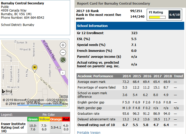近5年菲莎机构排名,全BC省中学第99位,综合评分6.4分(满分10分)