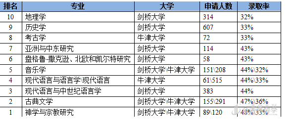 研究机构根据2018年牛津大学和剑桥大学的申请数据和结果统计分析,筛选出申请牛剑成功率最高的十个专业,其中不少专业成功率接近50%,一圆满名校梦,不是不可能。下面这个表格可以帮助大学了解今年的数据统计。
