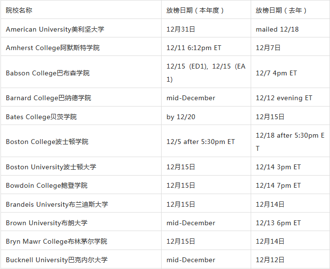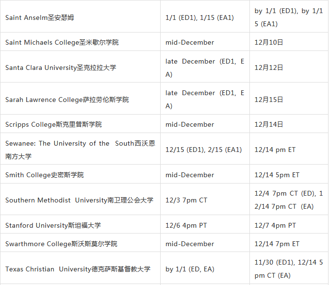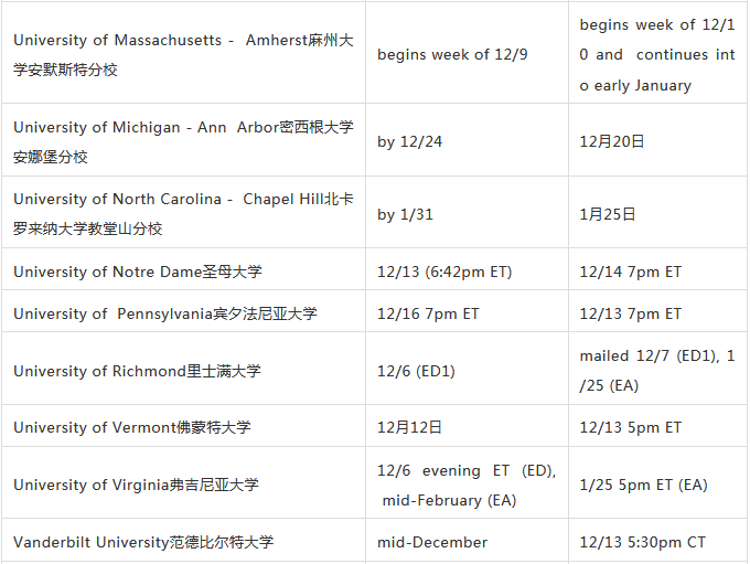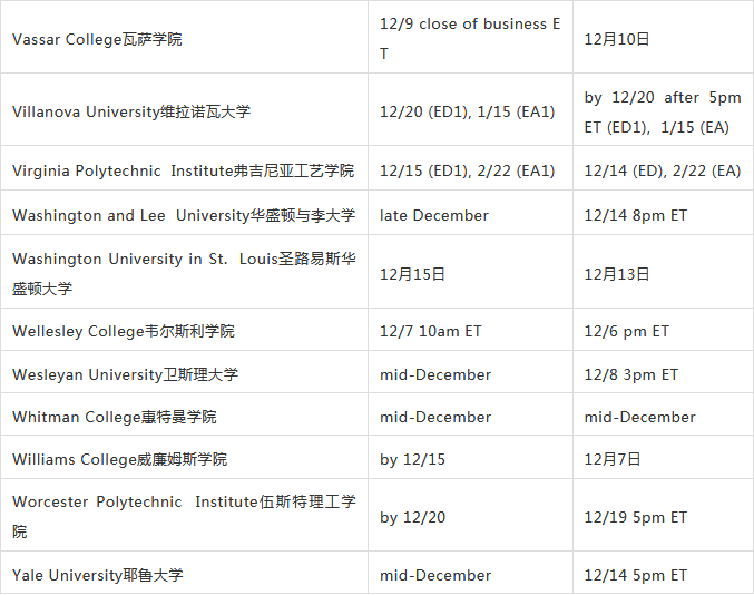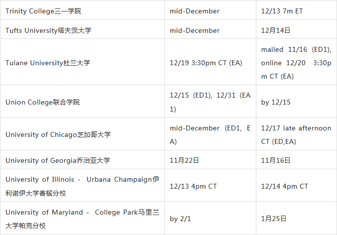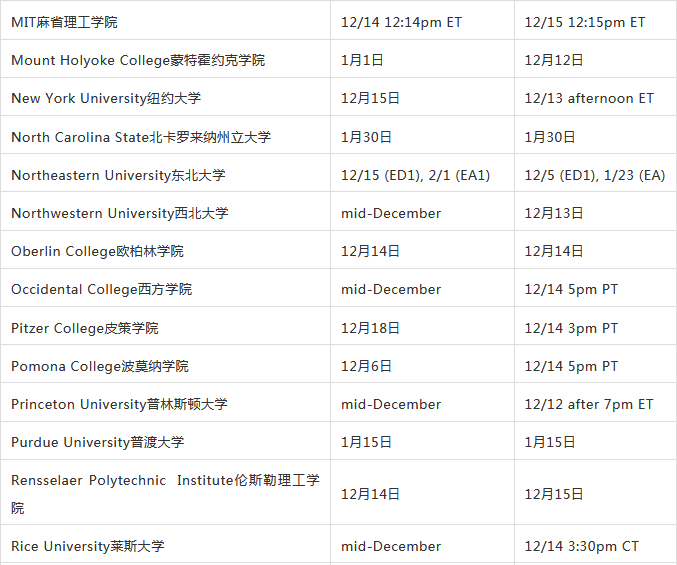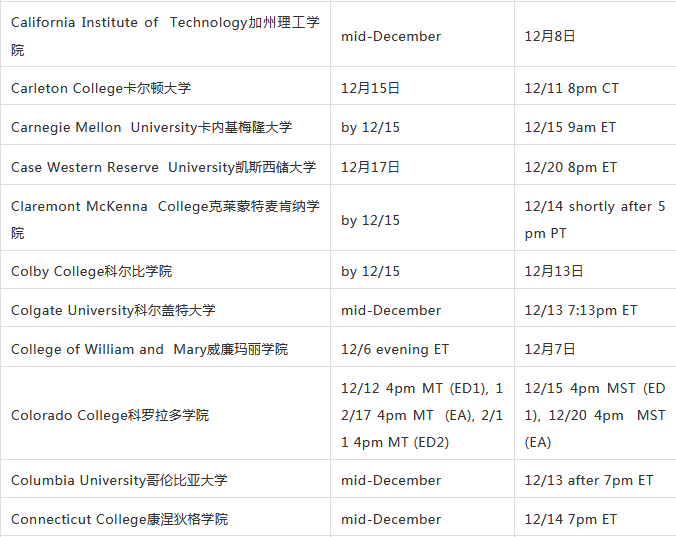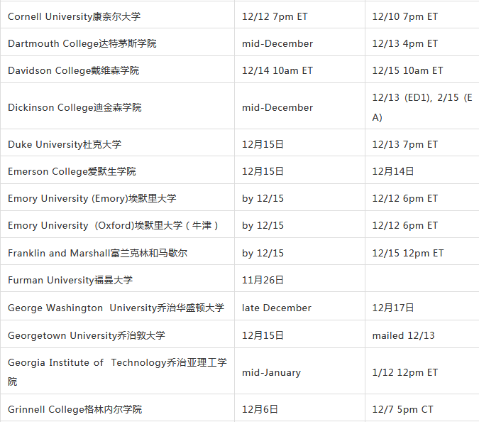 2020年(或2024届)美国大学EA/ED放榜时间如下: