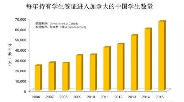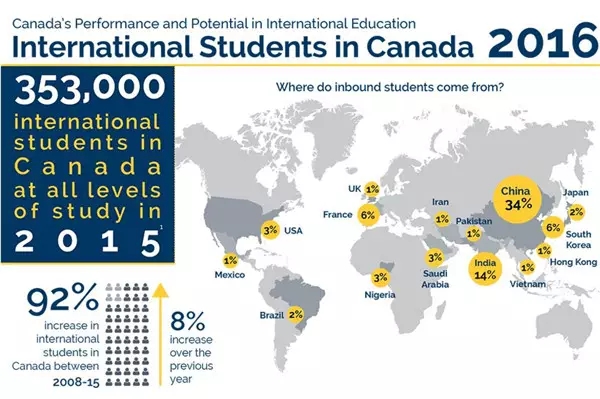2015年一共有353,000留学生在加拿大学习,其中中国学生人数最多占比34%,其次是印度的14%,法国和韩国的6%。