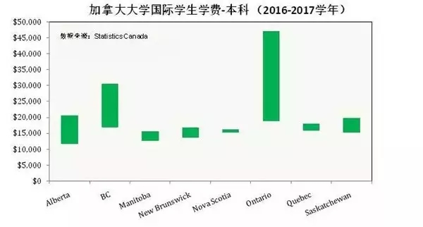 各省本科生学费水平,安省最贵,其次是BC省和艾伯塔省。