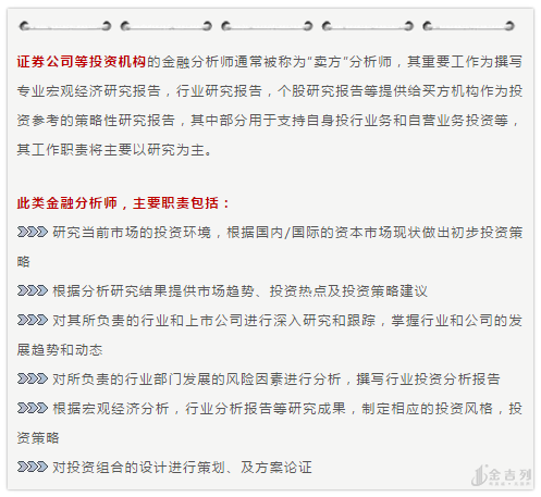 根据市场研究发现,在中国的CFA学员和持证人的职业发展方向主要可以根据下图分为 投资(基金)公司,证券公司以及商业银行和保险机构 ,在此类机构中,他们分别承担着金融分析师不同的工作职责。
