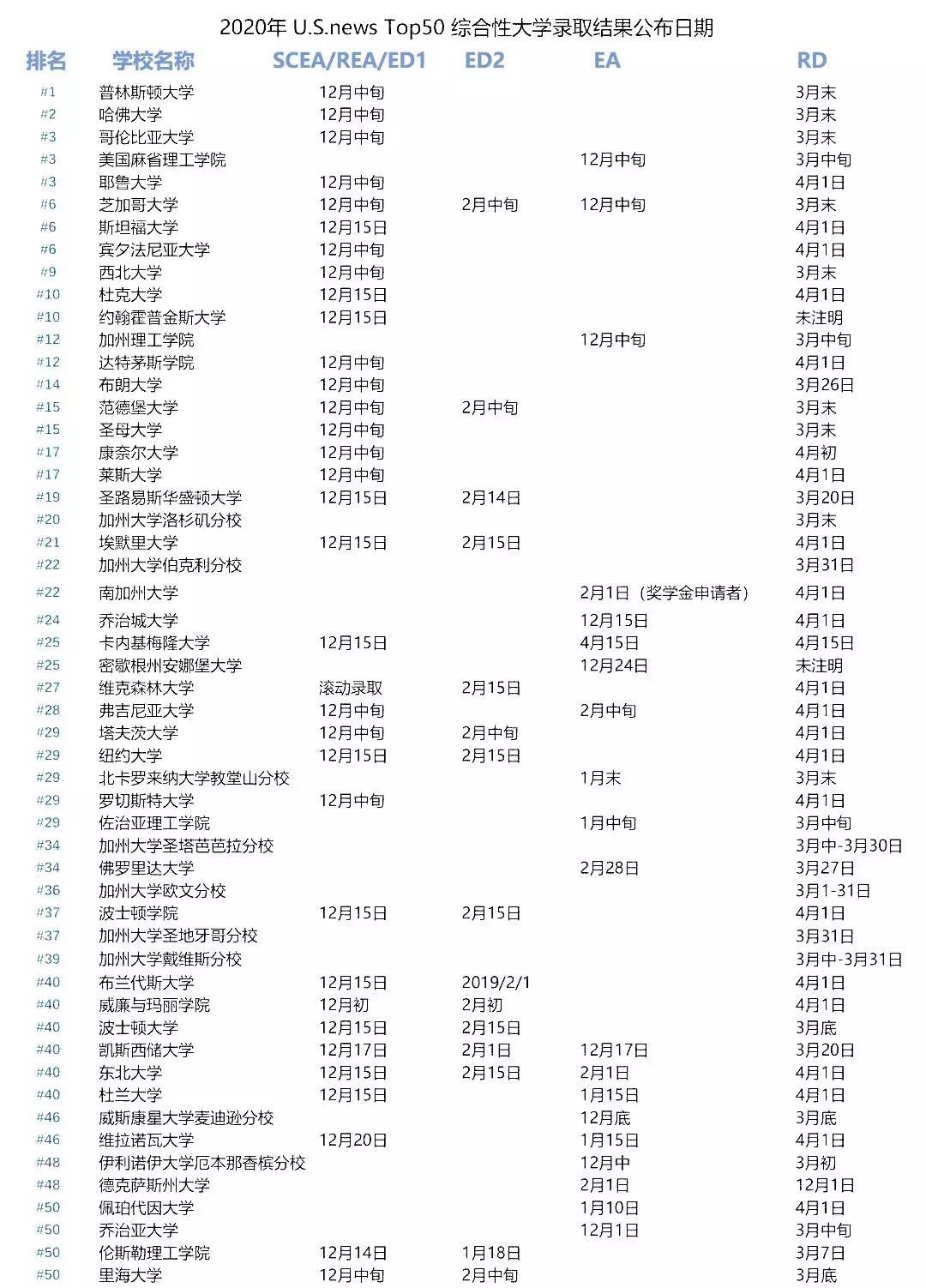 EA/ED 的集中化放榜時间大概从 12 月中下旬刚开始,以便让大伙儿密切关注放榜状况,网编归纳了 2020 年 TOP50 大 U+TOP30 文理学院的录取放榜時间,快点儿取出小本子记录下来吧。
