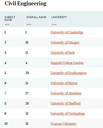今天我们就一起来看一下2020年TIMES排名中,土木工程专业中英国大学的排名,其中排名前15位的大学是:
