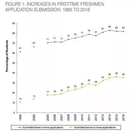 来自一年级学生的申请数量比去年增加了7%,转学生申请增加了1%,而国际学生申请平均增加了13%。 随着大学通过各种渠道加大招生力度,以及通过common和Coalition系统进行申请的学生数量越发增多,这种增长趋势目前没有减弱的迹象。尽管美国高中生总体人数趋于稳定,但由于学生平均申请的大学数量增多,以及美国高校对国际申请人的重视。所有这些因素只会造成一个结果—— 美国大学的申请人将会继续暴增。