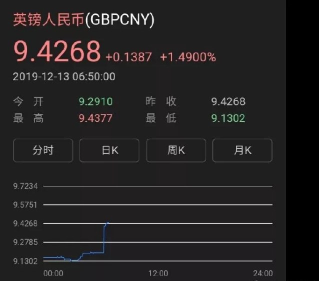 今天早些时候,投票结束后出口民调已经提前预告了这个结果,英镑随即应声暴涨2.3%,英镑对人民币一度飙升至9.4268,达到 2018年5月以来最高水平 。