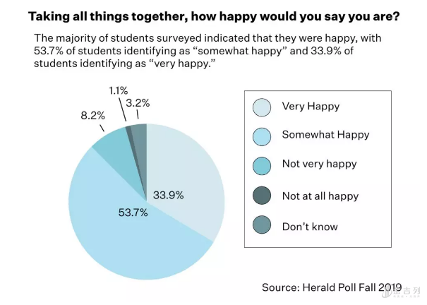 考虑所有因素,你有多幸福?” 大部分学生表示自己是幸福的,53.7%的学生认为自己“有些幸福”,33.9%的学生认为自己“非常幸福”。 这项调查由开放式问题和1-5分制的选择题组成,结果完全是由学生的意见决定的 。
