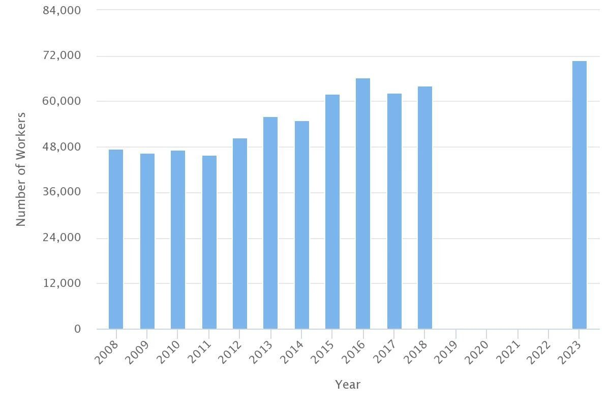 就业展望: 从2018年的64,200人增加到2023 年的70,800人,并为澳大利亚创造约58,000个新工作(每年约11,600个),79%为全职工作(高于平均的66%)。